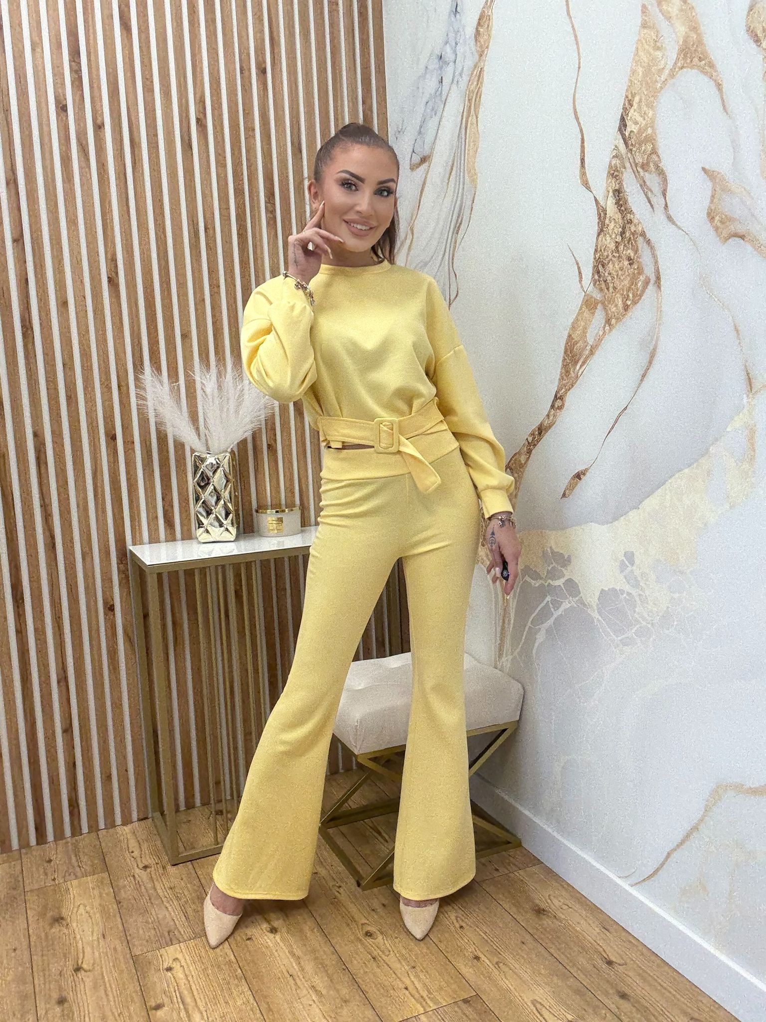 Komplet z bluzka z paseczkiem i spodniami w typie dzwony. Rozmiar uniwersalny.