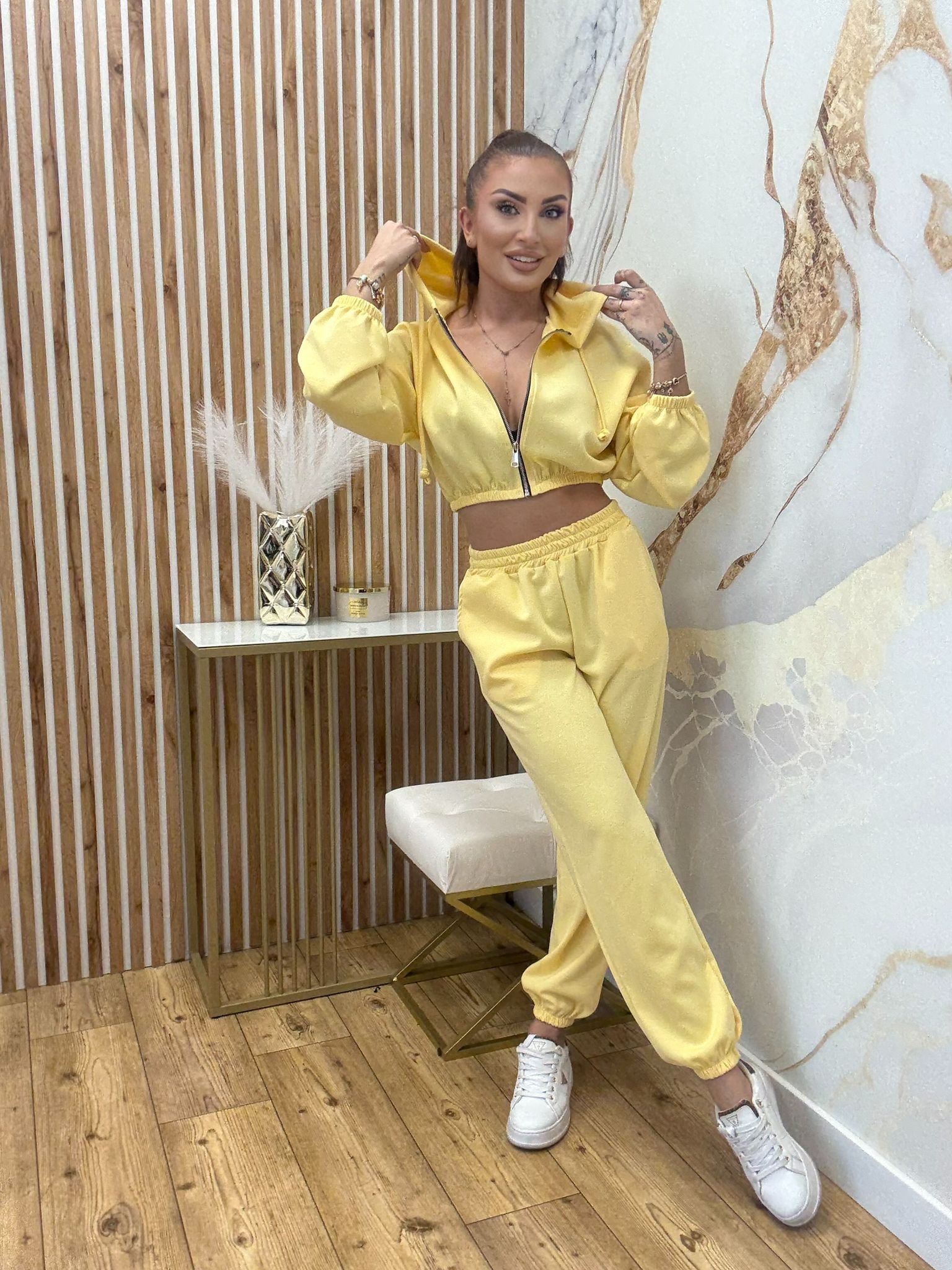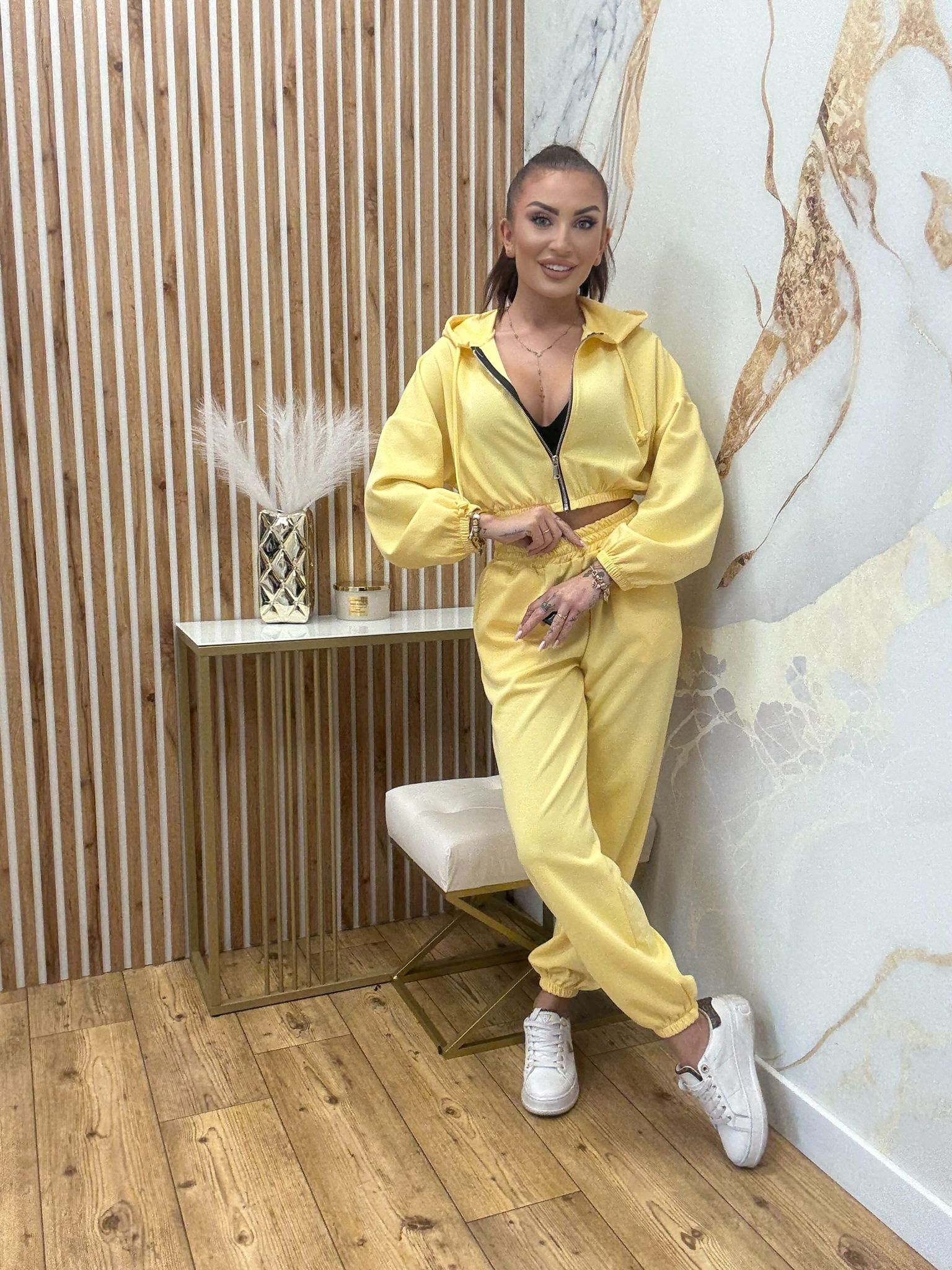 Komplet z krótszą bluzą z kapturem i spodniami ze ściągaczami na nogawkach w rozmiarze uniwersalnym,