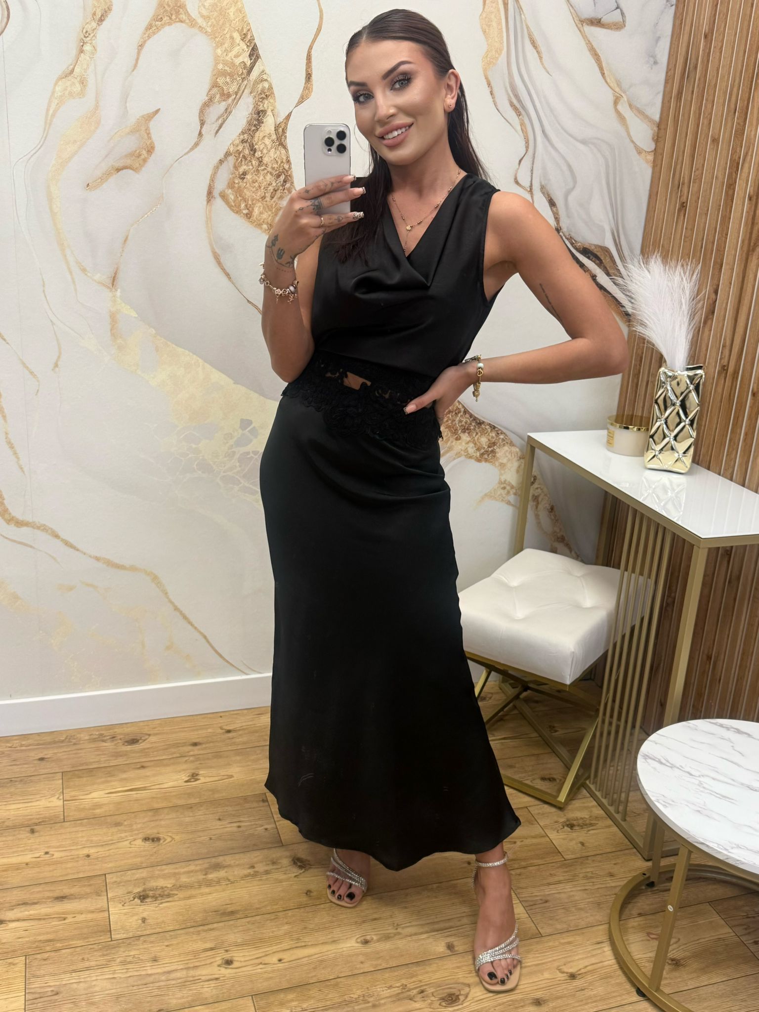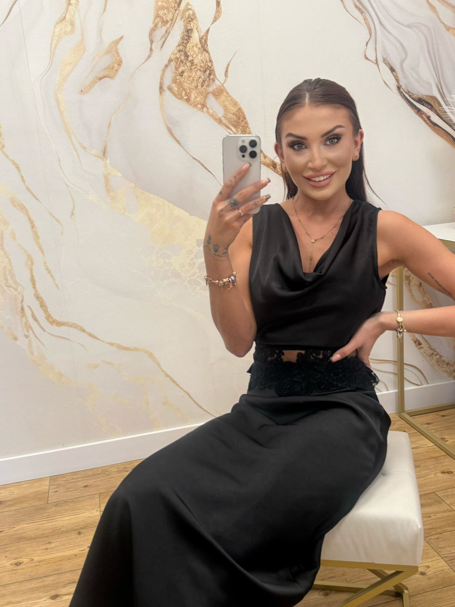 Komplet posiada ozdobną koronkę w tali bluzeczki oraz z tyłu zameczek i sznurki do związania.
